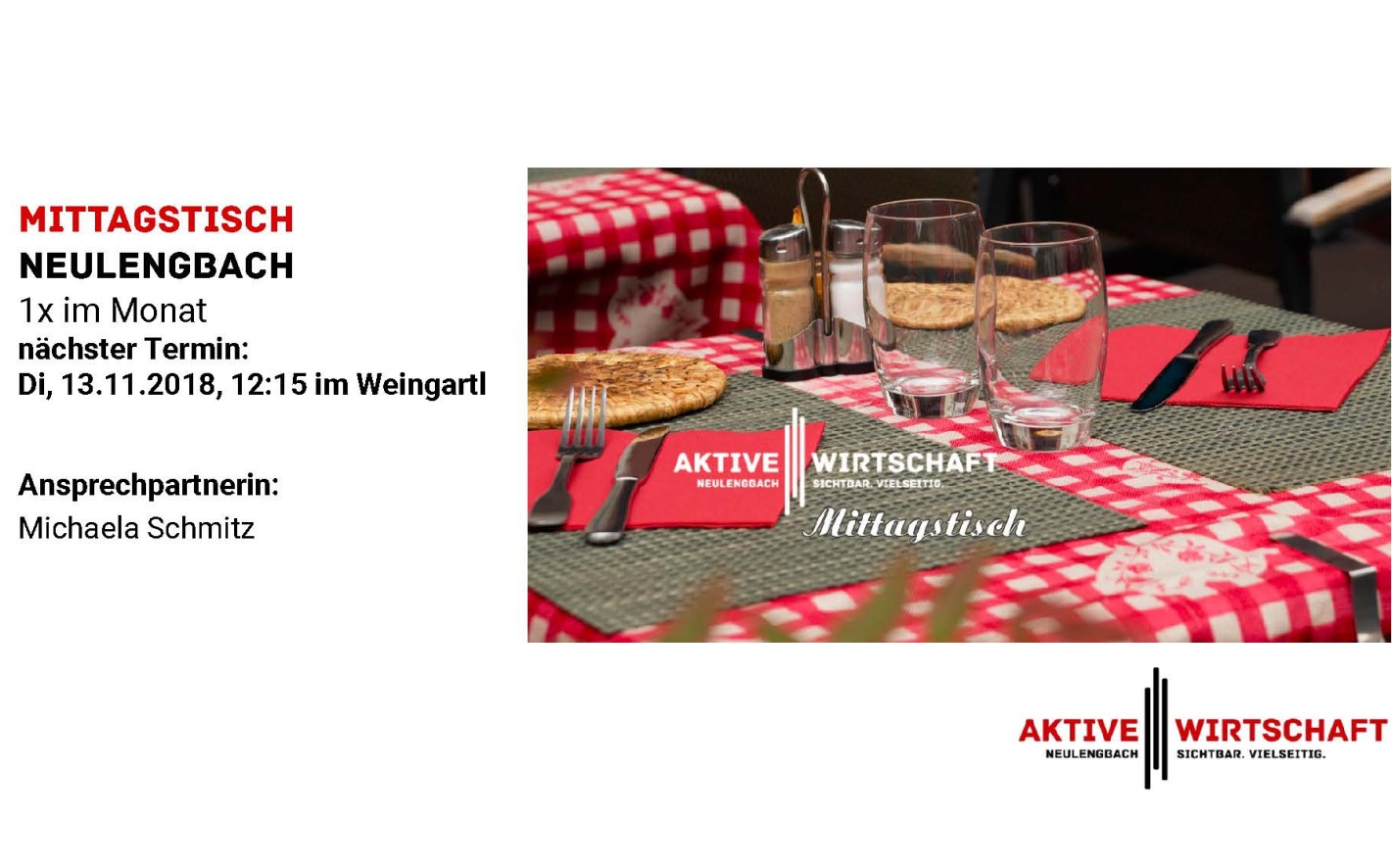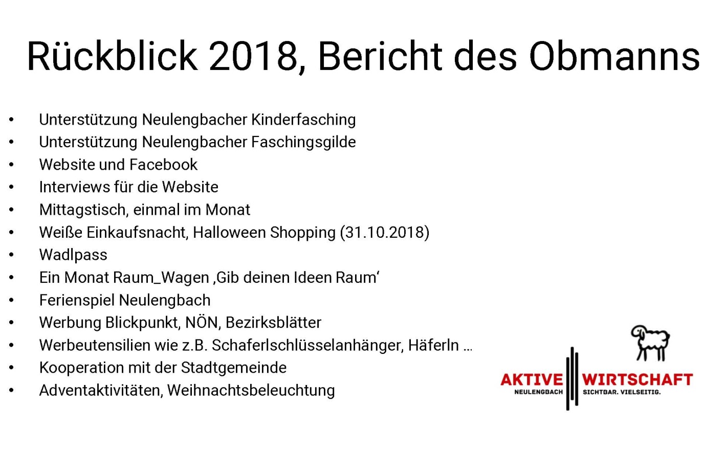 Am 19.10.2018 fand die Generalversammlung der Aktiven Wirtschaft Neulengbach im Sitzungssaal des neuen Rathauses statt. Nach dem Rückblick auf 2018 durch Obmann Georg Brutschy und der Wahl des neuen Vorstands wurde unser Marketingplan für 2019 von Christa Berger, Theaterei St.Christophen, vorgestellt. Neben bereits bekannten Aktionen wie der weiße Einkaufsnacht, Halloween Shopping, dem Wadlpass kommt auch der Raum_Wagen 2019 mit dem Thema 'Kunst und Handwerk' wieder ins Zentrum. Ebenso erscheint noch heuer der Neulengbacher 10er rechtzeitig vor Weihnachten im neuen Design - neue Sackerln wird es auch dazu geben. Intensiviert wird die Zusammenarbeit mit der Kultur und der Gastronomie Neulengbach, die Damen vom Speiselokal haben sich des Themas 'Wochenmarkt' angenommen und schauen, was möglich ist. Wir, der Vorstand der Aktiven Wirtschaft, suchen noch MitgestalterInnen für den Neulengbacher Advent in Zusammenarbeit mit der Stadtgemeinde Neulengbach. Hier möchten wir zusätzliche Akzente setzen. Die Mitglieder der Villa Rosa haben eine Gesundheitsplattform gegründet und suchen Gleichgesinnte. Dank Jungunternehmer Felix Hechtl können wir wieder Gemüse aus Neulengbach kaufen! Wir hoffen auf eine verstärkte Zusammenarbeit mit unseren Handwerksbetrieben und möchten die regionale Vernetzung ausbauen. Ein sehr wichtiges Thema scheint uns die Erreichbarkeit der einzelnen Geschäften und Lokale zu sein. Wir haben in Neulengbach das Glück, dass vieles leicht erreichbar ist - auch zu Fuß und mit dem Rad - hier suchen wir noch dringend MitgestalterInnen für die Kampagne 'Das Gute ist näher als Du denkst - Erreichbarkeiten in Neulengbach zu Fuß und mit dem Rad' - melde dich bei uns! WIR gestalten den Wirtschaftsstandort Neulengbach!